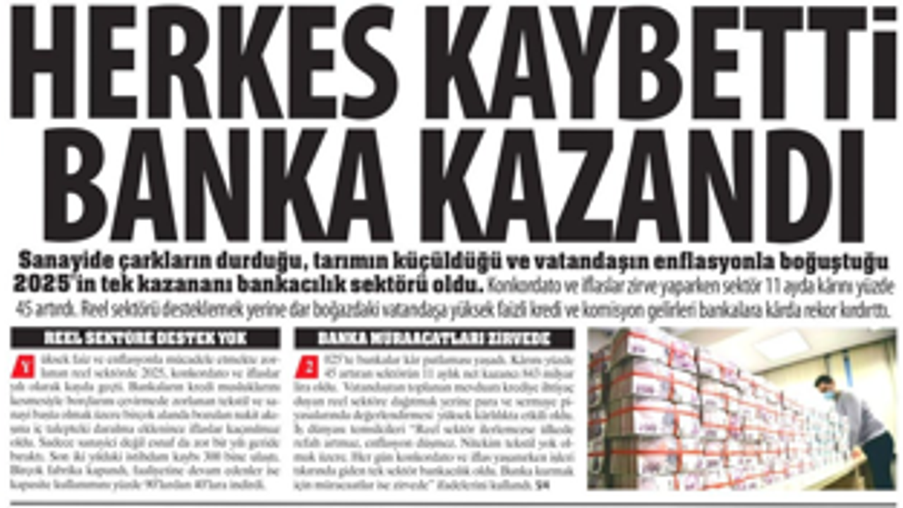 Sanayide çarkların durduğu, tarımın küçüldüğü ve vatandaşın enflasyonla boğuştuğu 2025’in tek kazananı bankacılık sektörü oldu. Konkordato ve iflaslar zirve yaparken sektör 11 ayda kârını yüzde 45 artırdı. Reel sektörü desteklemek yerine dar boğazdaki vatandaşa yüksek faizli kredi ve komisyon gelirleri bankalara kârda rekor kırdırttı.
