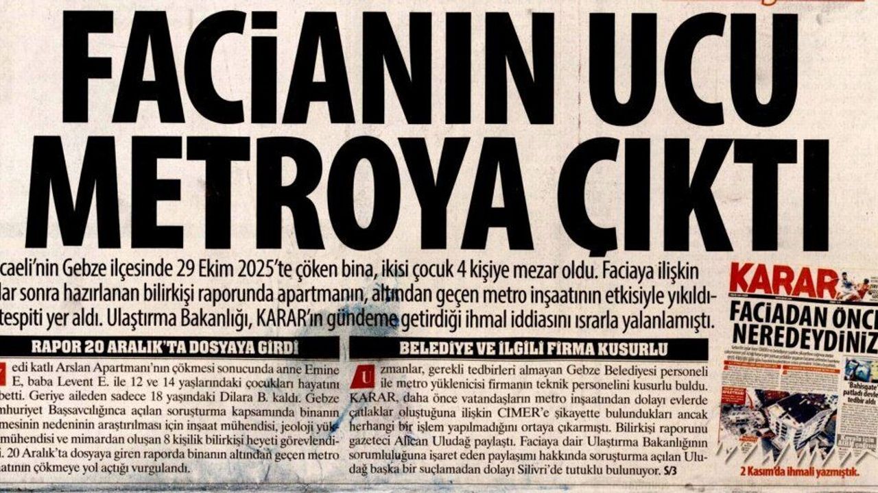 Karar'ın haberine göre, Gebze’de 29 Ekim 2025’te çöken Arslan Apartmanı ile ilgili bilirkişi raporu açıklandı. Raporda, zemindeki boşluğun metro çalışmaları nedeniyle oluştuğu ve çökmede ana etken olduğu belirtildi. Olayda 4 kişi hayatını kaybetmiş, 18 yaşındaki Dilara B. İse sağ kurtulmuştu. Yetkililer, yüklenici ve teknik personeli birinci, belediye ve kontrol ekiplerini ikinci derecede sorumlu buldu.