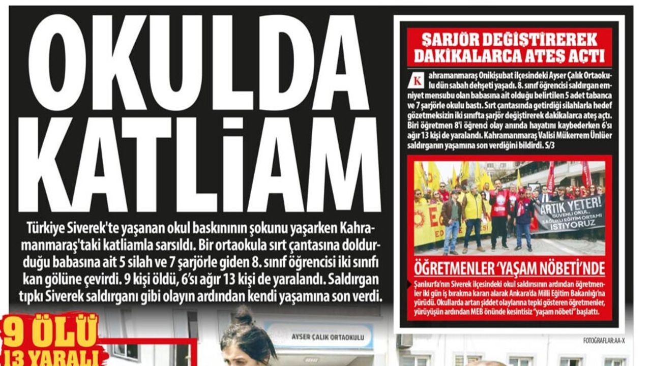 Türkiye Siverek'te yaşanan okul baskınının şokunu yaşarken Kahramanmaraş'taki katliamla sarsıldı. Bir ortaokula sırt çantasına doldurduğu babasına ait 5 silah ve 7 şarjörle giden 8. sınıf öğrencisi iki sınıfı kan gölüne çevirdi. 9 kişi öldü, 6’sı ağır 13 kişi de yaralandı. Saldırgan tıpkı Siverek saldırganı gibi olayın ardından kendi yaşamına son verdi.