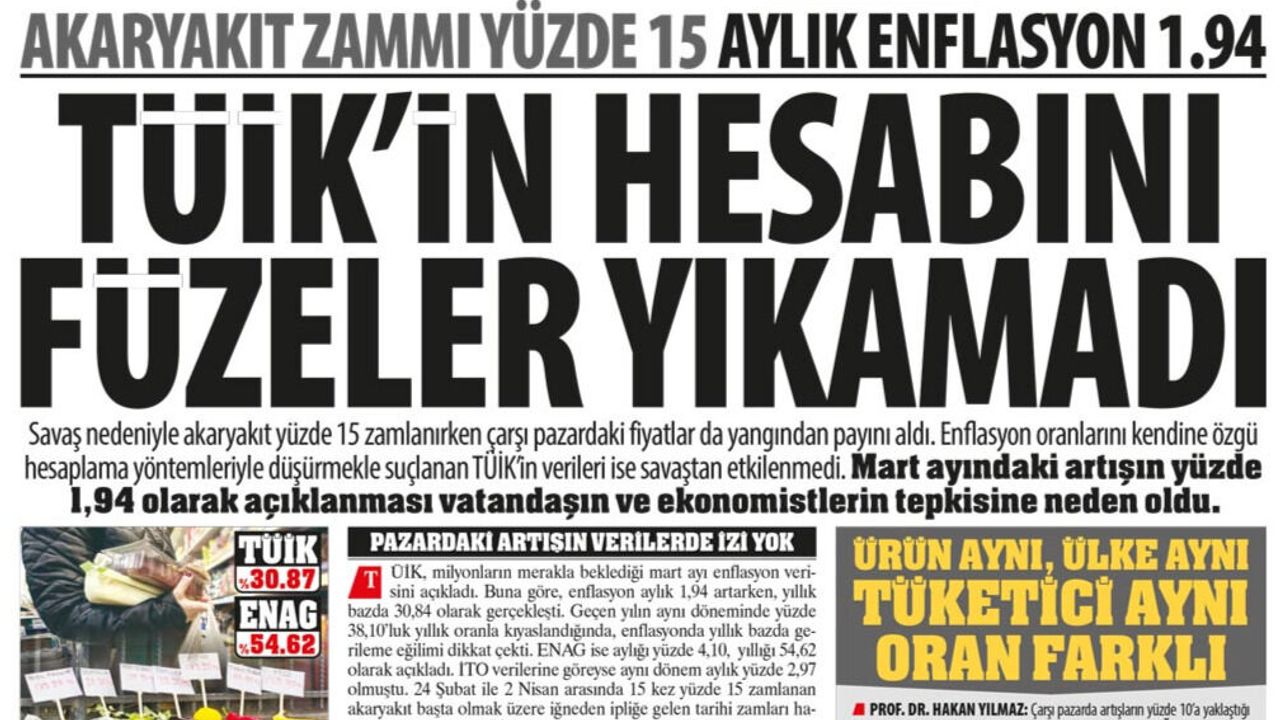 TÜİK, milyonların merakla beklediği mart ayı enflasyon verisini açıkladı. Buna göre, enflasyon aylık 1,94 artarken, yıllık bazda 30,84 olarak gerçekleşti. Geçen yılın aynı döneminde yüzde 38,10’luk yıllık oranla kıyaslandığında, enflasyonda yıllık bazda gerileme eğilimi dikkat çekti. ENAG ise aylığı yüzde 4,10, yıllığı 54,62 olarak açıkladı. İTO verilerine göreyse aynı dönem aylık yüzde 2,97 olmuştu. 24 Şubat ile 2 Nisan arasında 15 kez yüzde 15 zamlanan akaryakıt başta olmak üzere iğneden ipliğe gelen tarihi zamları hatırlatan uzmanlar, TÜİK’in bu artışları göz ardı ettiğini belirtti.