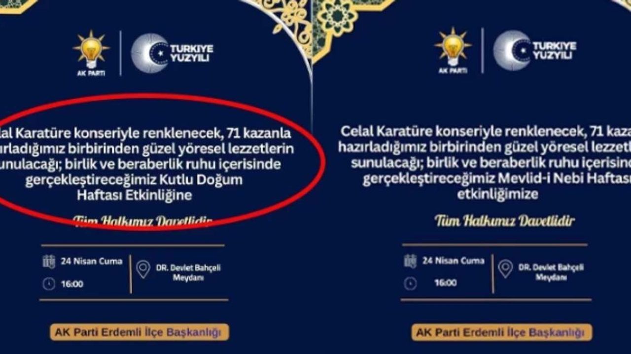Mersin Erdemli’de AKP İlçe Başkanlığı’nın etkinlik davetiyesinde, geçmişte FETÖ tarafından istismar edildiği için yasaklanan 'Kutlu Doğum Haftası' ifadesinin kullanılması tartışma yarattı. Tepkiler sonrası kullanılan ifade değiştirilirken, olay savcılığa taşındı.