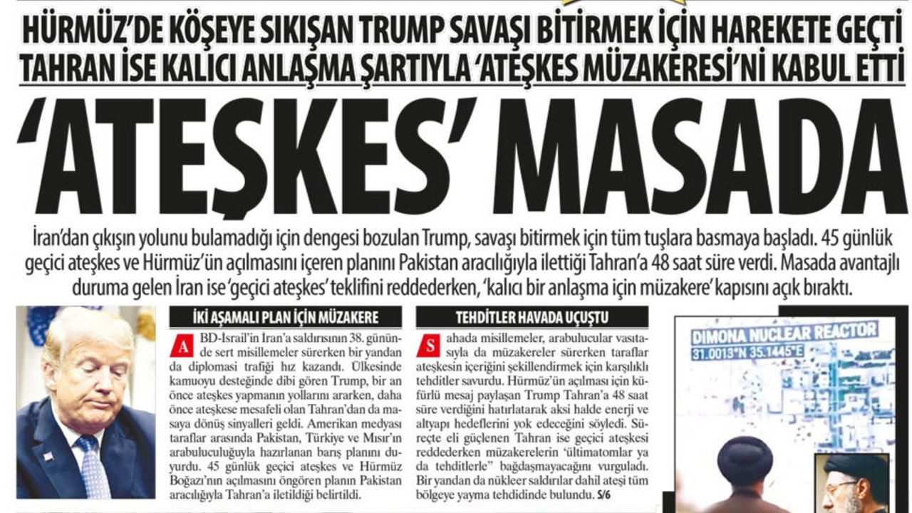 Karar'ın haberine göre, ABD ve İran arasında Pakistan, Türkiye ve Mısır’ın arabuluculuğuyla hazırlanan iki aşamalı barış planı netleşti. 45 günlük geçici ateşkes ve Hürmüz Boğazı’nın açılmasını öngören plana Tahran “ültimatomlara boyun eğmeyiz” yanıtını verirken, Trump’ın savaş hukukunu aşan tehditleri tansiyonu zirveye taşıdı.