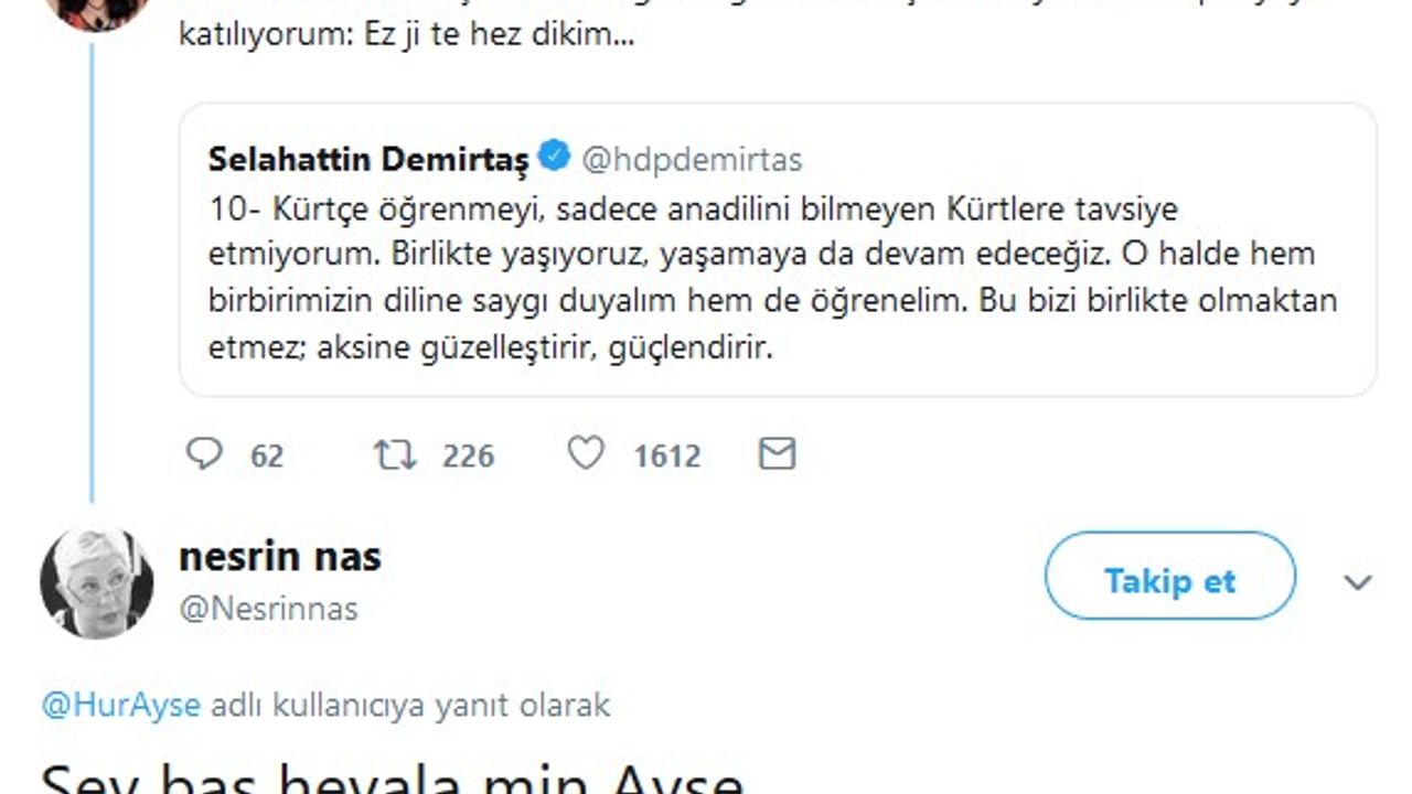 Bunun üzerine eski milletvekili Nesrin Nas da Ayşe Hür’e sosyal medya hesabından, “Şev baş hevala min Ayşe (İyi akşamlar Ayşe)” şeklinde Kürtçe mesaj yazdı. Ayşe Hür de Nesrin Nas’a yine Kürtçe, “Şevbaş rûmetgiran hevale min Nesrin! (İyi akşamlar arkadaşım Nesrin)” diye yanıt verdi.