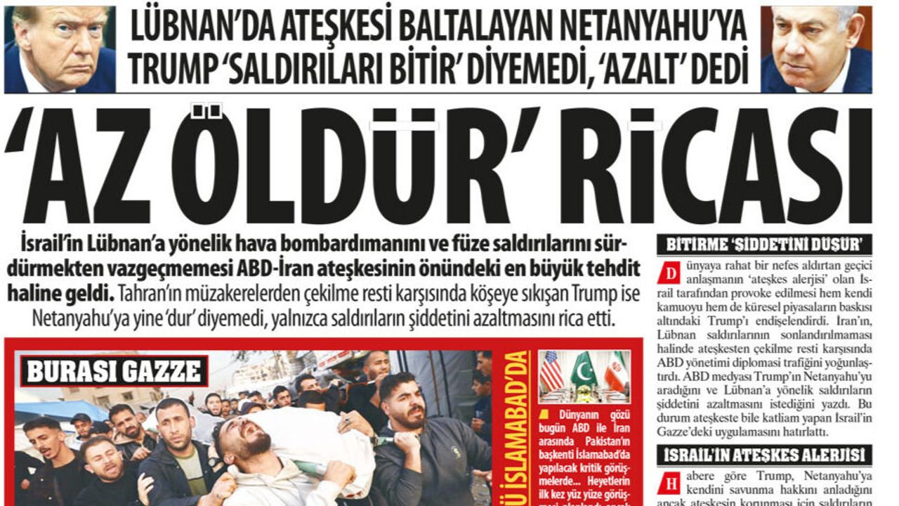 Karar'ın haberine göre, İran-ABD İslamabad’da kalıcı ateşkesi görüşmeyi planlarken İsrail’in Lübnan’a saldırıları süreci zorluyor. Netanyahu ile telefonda görüşen Trump “Lübnan’a yönelik saldırıları azaltması gerektiğini söyledim” dedi. ‘Gazze kasabı’nın cevabı “Doğrudan müzakere yürüteceğiz ama ateşkes olmayacak” oldu.
