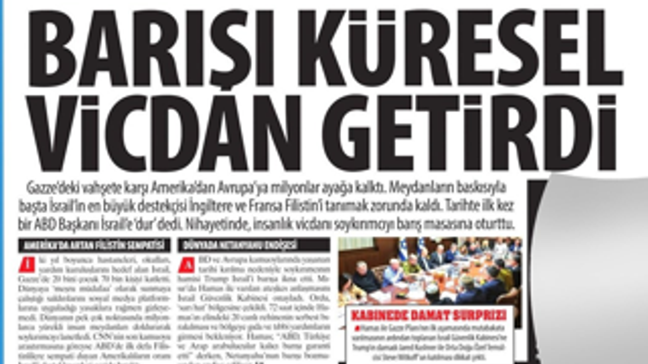Karar'ın haberine göre, 7 Ekim 2023’ten bu yana Gazze’de soykırım yapan İsrail’i barışa zorlayan, vicdan sahibi milyonlarca insanın meydanları doldurması oldu. Küresel Sumud Filosu’yla tepki zirveye çıktı. Katliamın en büyük destekçileri artan baskıya dayanamayarak Filistin’i tanıdı. Trump da daha fazla direnemeyerek Netanyahu’yu masaya oturttu.