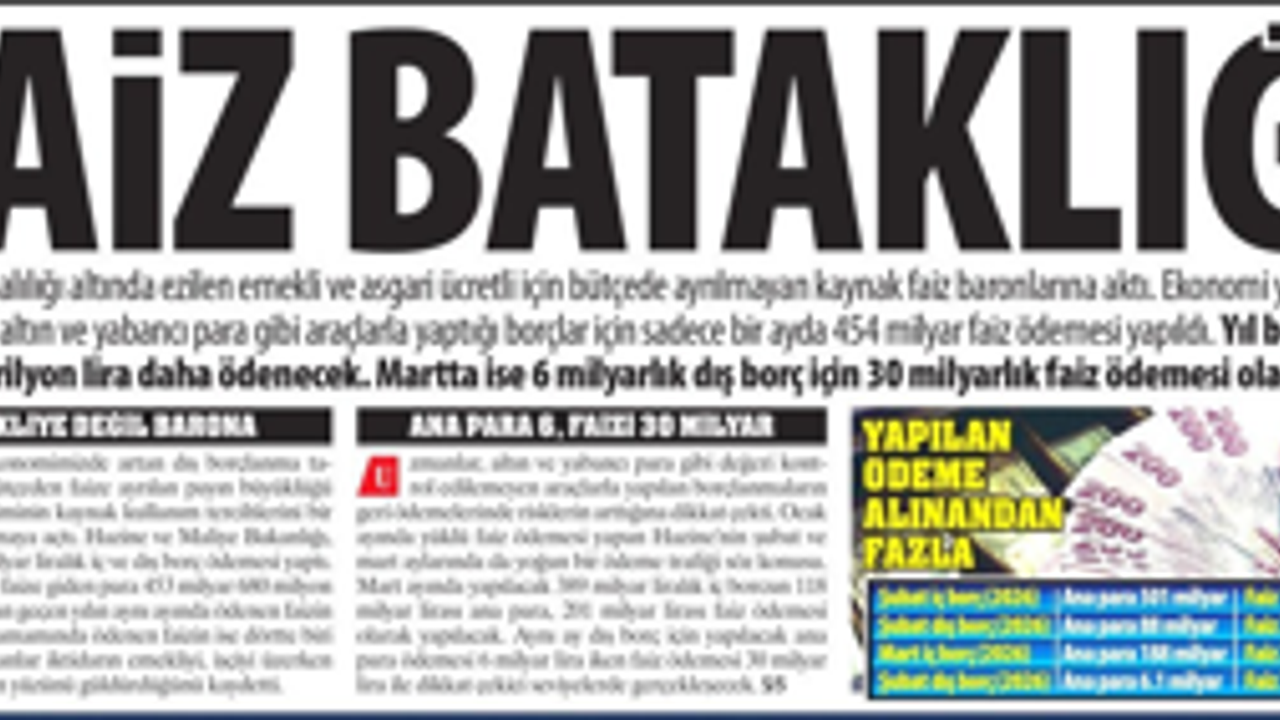 Hayat pahalılığı altında ezilen emekli ve asgari ücretli için bütçede ayrılmayan kaynak faiz baronlarına aktı. Ekonomi yönetiminin TÜFE, altın ve yabancı para gibi araçlarla yaptığı borçlar için sadece bir ayda 454 milyar faiz ödemesi yapıldı. Yıl boyunca 2.3 trilyon lira daha ödenecek. Martta ise 6 milyarlık dış borç için 30 milyarlık faiz ödemesi olacak.