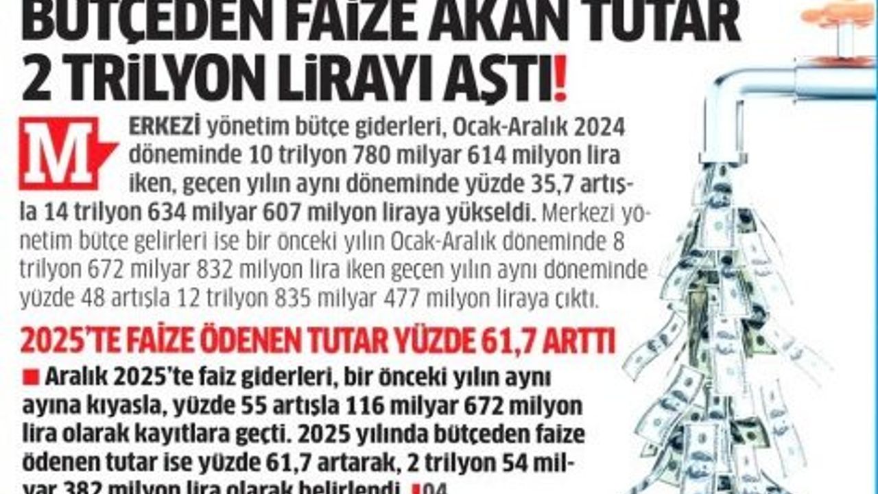 Borcu borçla ödemenin faturası, borç ve faizlerine akıtılan kaynaklar oluyor. Faiz ödemesi arttıkça bütçe açığı da yükseliyor. Merkezi yönetim bütçesi 2025 yılı Aralık ayında 528,1 milyar lira, 2025'in tamamında da 1,8 trilyon lira açık verdi. Bütçeden faize Aralık’ta 116,7 milyar lira, 2025’in tamamında ise 2,1 trilyon lira ödendi.