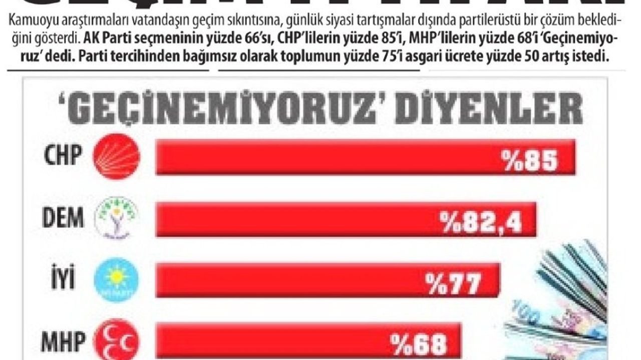 Kamuoyu araştırmaları vatandaşın geçim sıkıntısına, günlük siyasi tartışmalar dışında partilerüstü bir çözüm beklediğini gösterdi. AK Parti seçmeninin yüzde 66’sı, CHP’lilerin yüzde 85’i, MHP’lilerin yüzde 68’i ‘Geçinemiyoruz’ dedi. Parti tercihinden bağımsız olarak toplumun yüzde 75’i asgari ücrete yüzde 50 artış istedi.