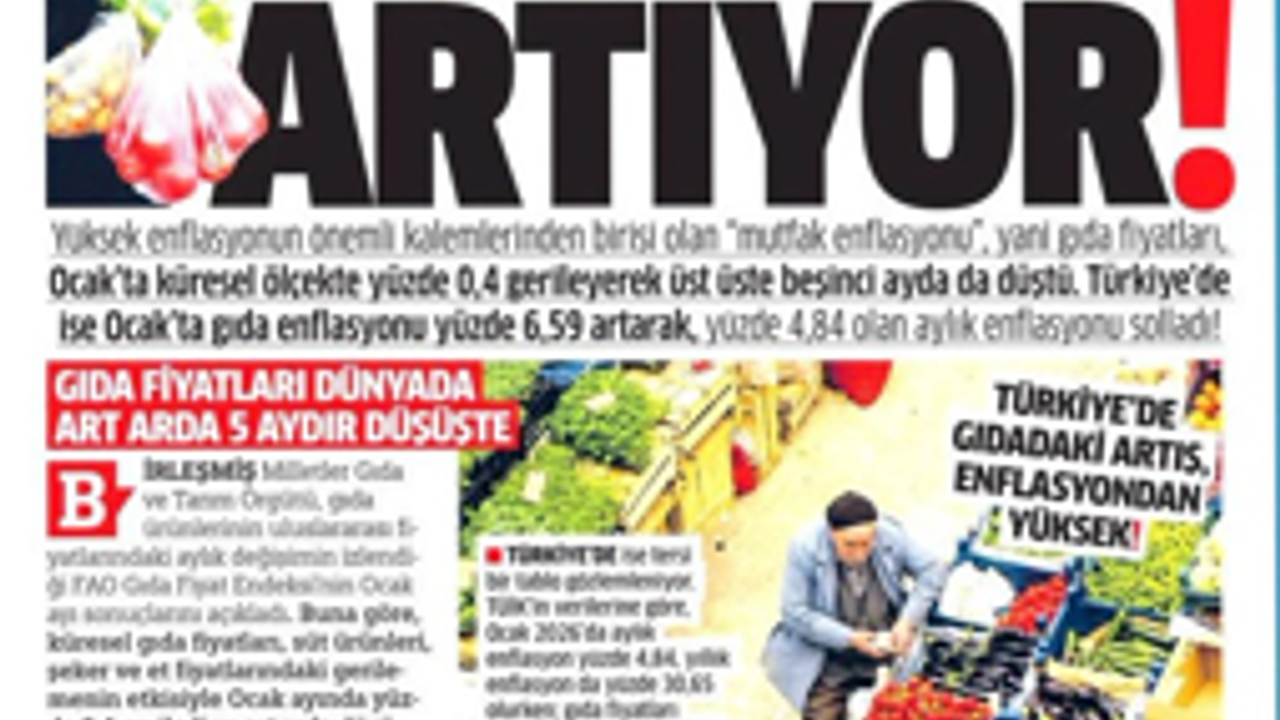 Yüksek enflasyonun önemli kalemlerinden birisi olan “mutfak enflasyonu”, yani gıda fiyatları Ocak’ta küresel ölçekte yüzde 0,4 gerileyerek üst üste beşinci ayda da düştü. Türkiye’de ise Ocak’ta gıda enflasyonu yüzde 6,59 artarak, yüzde 4,84 olan aylık enflasyonu solladı!