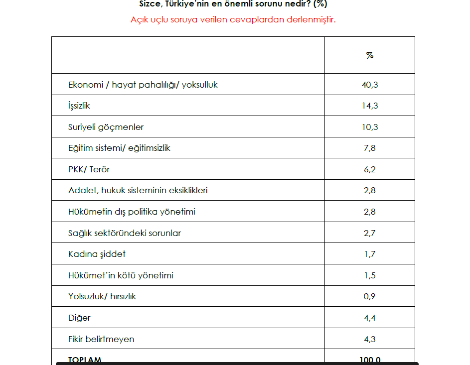 “Ekonomi” ve “Issizlik” %54,6 ile Türkiye’nin en önemli sorunu olarak karsimiza çikmaktadir. “Suriyeli göçmenler” (%10,3) üçüncü sirada görülmektedir.