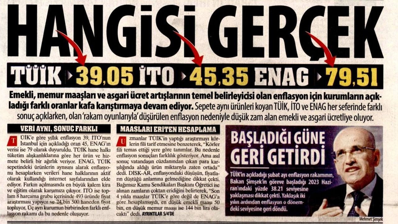Karar'da yer alan habere göre, Türk halkının refahını belirleyen en önemli veri kalemi olan enflasyondaki belirsizlik kaos yarattı. TÜİK’e göre yıllık enflasyon yüzde 39,05, İTO’nun İstanbul için açıkladığı oran yüzde 45.35, ENAG’ın açıkladığı veri ise yüzde 79,51 oldu. Uzmanlar 3 kurumun 3 farklı sonucunu değerlendirerek, “Hangisi doğru tartışılır ama kesin olan bir şey var TÜİK’in verileri yanlış” dedi.