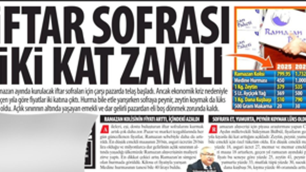 Ramazan ayında kurulacak iftar sofraları için çarşı pazarda telaş başladı. Ancak ekonomik kriz nedeniyle geçen yıla göre fiyatlar iki katına çıktı. Hurma bile etle yarışırken sofraya peynir, zeytin koymak da lüks oldu. Açlık sınırının altında yaşayan emekli ve dar gelirli pazardan eli boş dönmek zorunda kaldı.