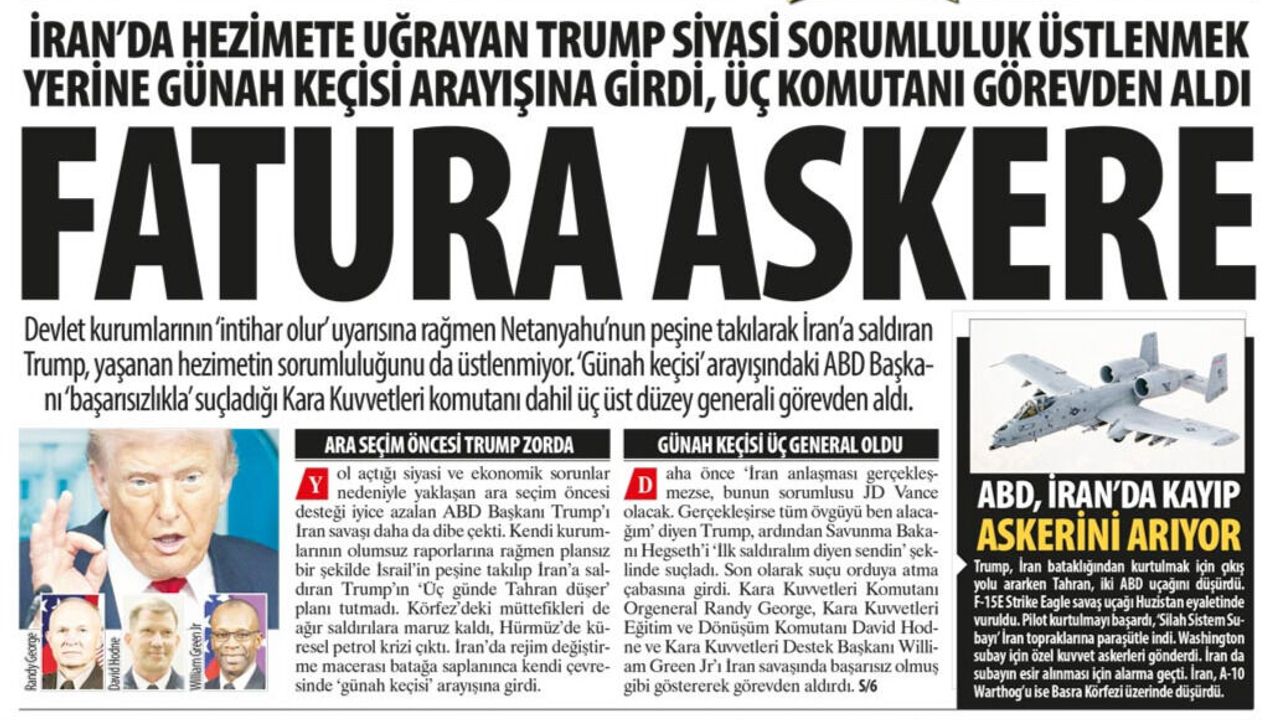 Devlet kurumlarının ‘intihar olur’ uyarısına rağmen Netanyahu’nun peşine takılarak İran’a saldıran Trump, yaşanan hezimetin sorumluluğunu da üstlenmiyor. ‘Günah keçisi’ arayışındaki ABD Başkanı ‘başarısızlıkla’ suçladığı Kara Kuvvetleri komutanı dahil üç üst düzey generali görevden aldı.