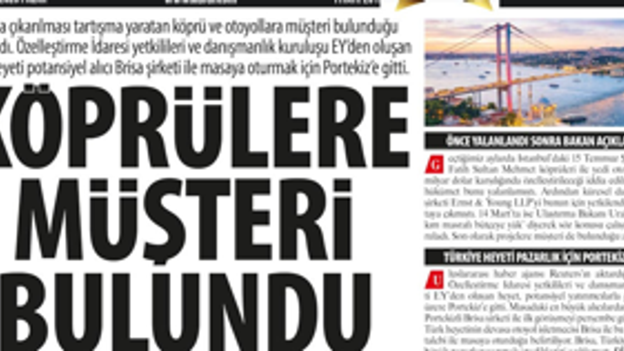 Satışa çıkarılması tartışma yaratan köprü ve otoyollara müşteri bulunduğu açıklandı. Özelleştirme İdaresi yetkilileri ve danışmanlık kuruluşu EY’den oluşan Türk heyeti potansiyel alıcı Brisa şirketi ile masaya oturmak için Portekiz’e gitti.