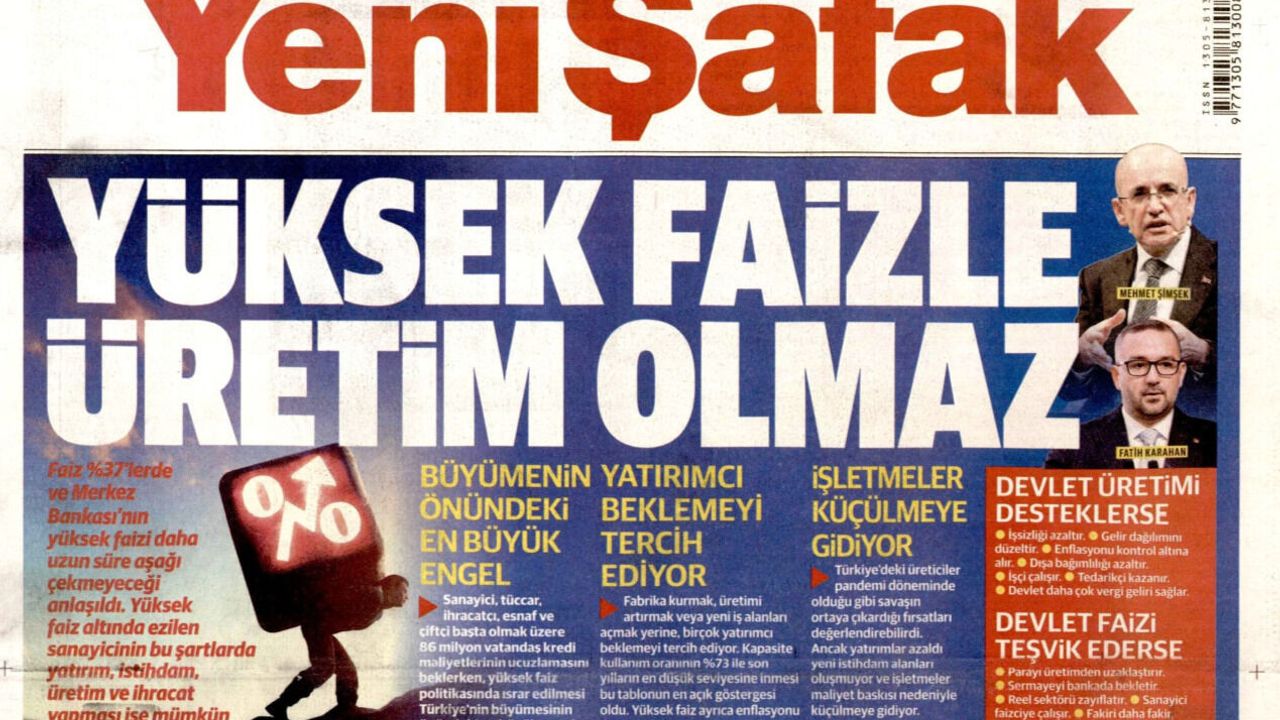 AKP iktidarı ile faiz konusunda barışamayan Yeni Şafak, bugünkü sayısında yine Mehmet Şimşek'i hedef aldı. Manşetten verilen mesajda, "Yüksek faizle üretim olmaz" başlığı kullanıldı.