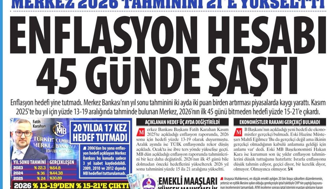 Enflasyon hedefi yine tutmadı. Merkez Bankası'nın yıl sonu tahminini iki ayda iki puan birden artırması piyasalarda kaygı yarattı. Kasım 2025'te bu yıl için yüzde 13-19 aralığında tahminde bulunan Merkez, 2026’nın ilk 45 günü bitmeden hedefi yüzde 15-21'e çıkardı.