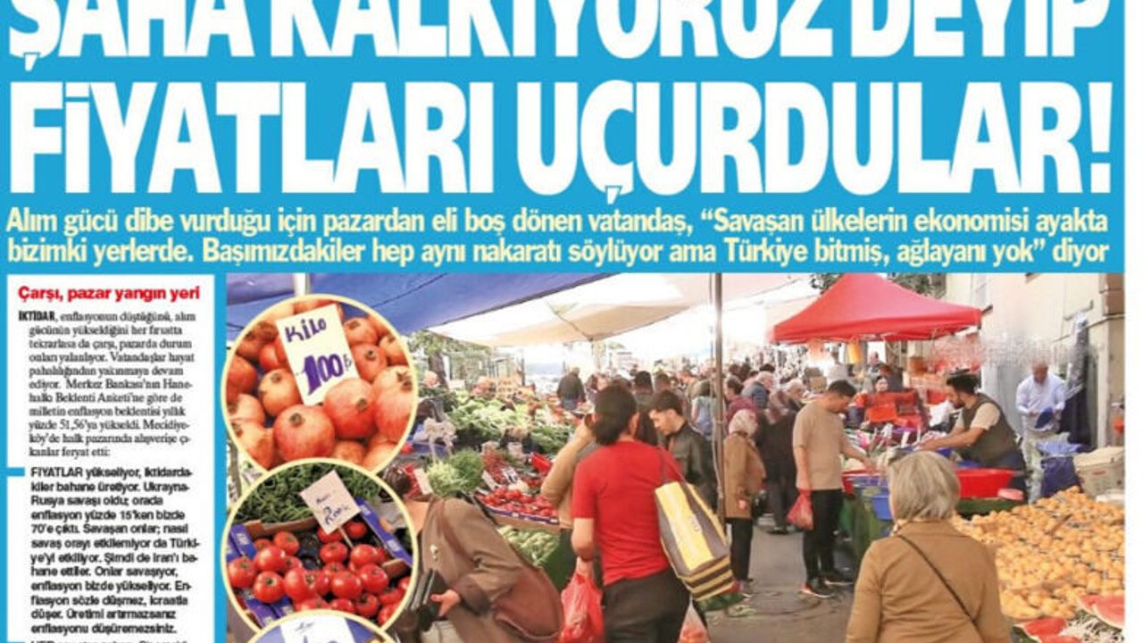 İktidar, enflasyonun düştüğünü, alım gücünün yükseldiğini her fırsatta tekrarlasa da çarşı, pazarda durum onları yalanlıyor. Vatandaşlar hayat pahalılığından yakınmaya devam ediyor. Merkez Bankası’nın Hanehalkı Beklenti Anketi’ne göre de milletin enflasyon beklentisi yıllık yüzde 51,56’ya yükseldi. Mecidiyeköy’de halk pazarında alışverişe çıkanlar feryat etti:
