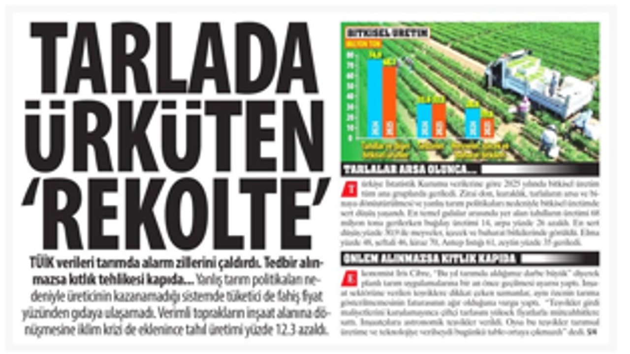 Türkiye İstatistik Kurumu verilerine göre 2025 yılında bitkisel üretim tüm ana gruplarda geriledi. Zirai don, kuraklık, tarlaların arsa ve binaya dönüştürülmesi ve yanlış tarım politikaları nedeniyle bitkisel üretimde sert düşüş yaşandı. En temel gıdalar arasında yer alan tahılların üretimi 68 milyon tona gerilerken buğday üretimi 14, arpa yüzde 26 azaldı. En sert düşüş yüzde 30,9 ile meyveler, içecek ve baharat bitkilerinde görüldü. Elma yüzde 48, şeftali 46, kiraz 70, Antep fıstığı 61, zeytin yüzde 35 geriledi.