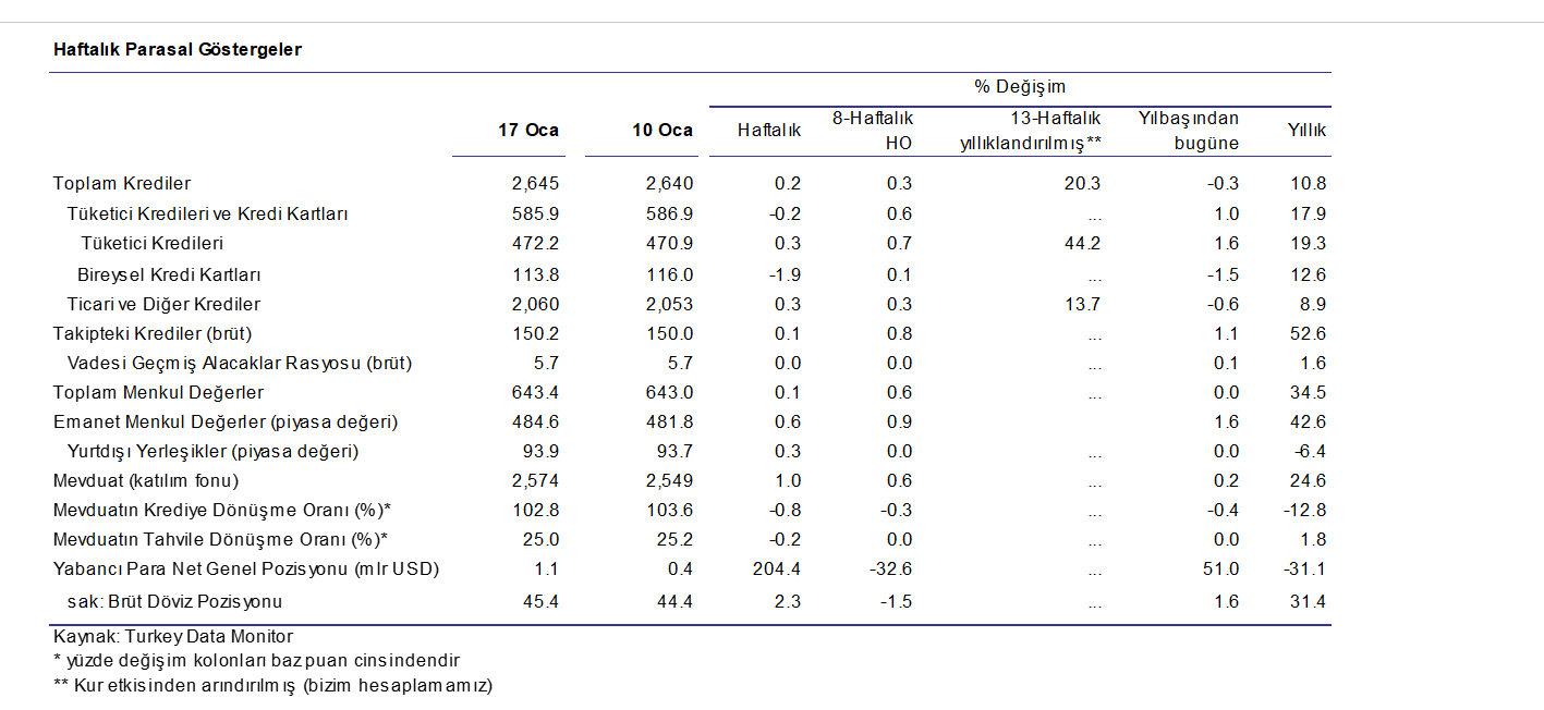 Aşağıdaki tablodan görüleceği üzere, son veri haftasında ticari krediler TL7 milyar büyüdüyse de, yılbaşında bu yana %0.6 daraldı ve son bir yılda enflasyonun çok gerisinde arttı. İşini veya cirosunu büyüten bir firmanın kredi kullanmasının şart olduğu düşünül,rse, ya bir çok firma krediye ulaşamıyor, ya da işini küçültüyor.