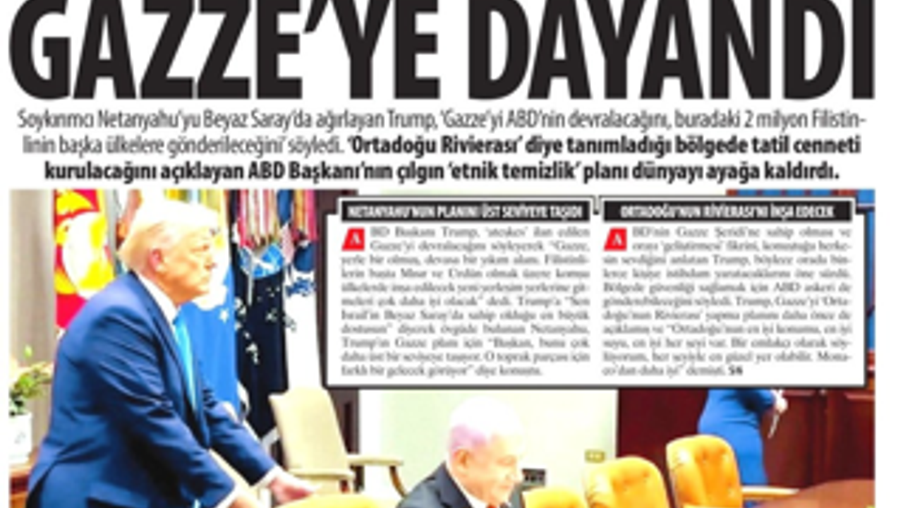 Soykırımcı Netanyahu’yu Beyaz Saray’da ağırlayan Trump, ‘Gazze’yi ABD’nin devralacağını, buradaki 2 milyon Filistinlinin başka ülkelere gönderileceğini’ söyledi. ‘Ortadoğu Rivierası’ diye tanımladığı bölgede tatil cenneti kurulacağını açıklayan ABD Başkanı’nın çılgın ‘etnik temizlik’ planı dünyayı ayağa kaldırdı.
