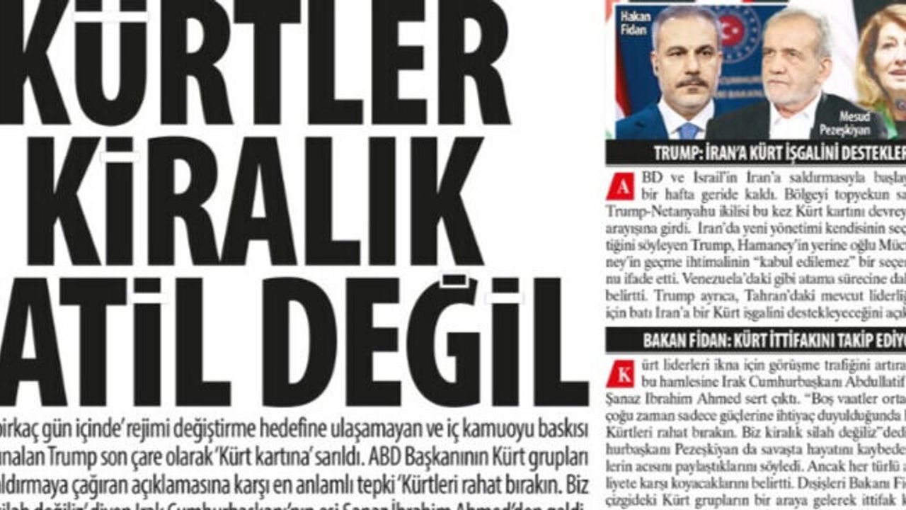Kürt liderleri ikna için görüşme trafiğini artıran Trump’ın bu hamlesine Irak Cumhurbaşkanı Abdullatif Reşid’in eşi Şanaz İbrahim Ahmed sert çıktı. “Boş vaatler ortada. Kürtler, çoğu zaman sadece güçlerine ihtiyaç duyulduğunda hatırlanıyor. Kürtleri rahat bırakın. Biz kiralık silah değiliz”dedi.İran Cumhurbaşkanı Pezeşkiyan da savaşta hayatını kaybeden Kürt ailelerin acısını paylaştıklarını söyledi. Ancak her türlü ayrılıkçı faaliyete karşı koyacaklarını belirtti. Dışişleri Bakanı Fidan, “Farklı çizgideki Kürt grupların bir araya gelerek ittifak kurduklarını görüyoruz. Hepsini takip ediyoruz” ifadesini kullandı.