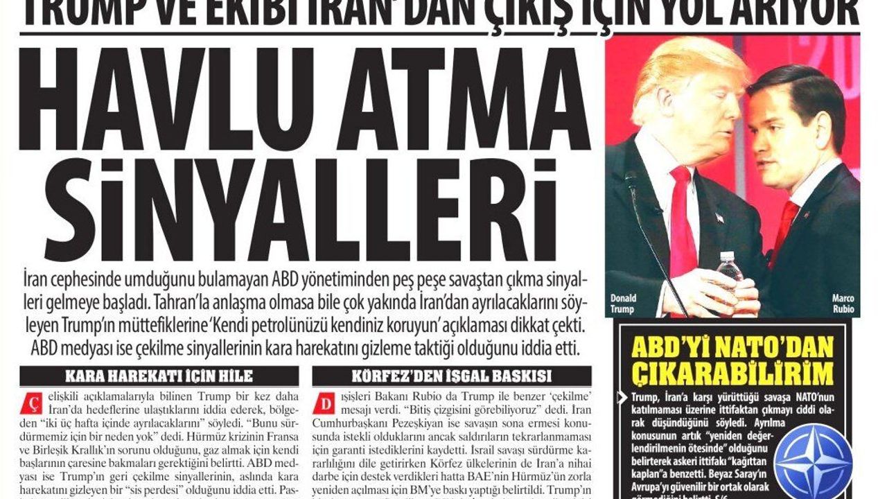İran cephesinde umduğunu bulamayan ABD yönetiminden peş peşe savaştan çıkma sinyalleri gelmeye başladı. Tahran’la anlaşma olmasa bile çok yakında İran’dan ayrılacaklarını söyleyen Trump’ın müttefiklerine ‘Kendi petrolünüzü kendiniz koruyun’ açıklaması dikkat çekti. ABD medyası ise çekilme sinyallerinin kara harekatını gizleme taktiği olduğunu iddia etti.
