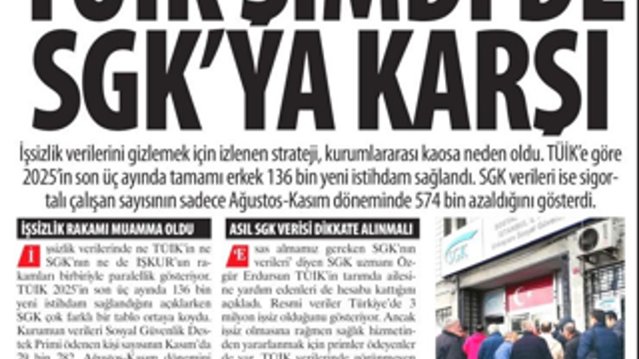 Karar'ın haberine göre, Devletin en önemli sorunlarından olan işsizlik rakamlarında büyük bir kaos yaşanıyor. TÜİK’in verileri ile SGK’nın ve İŞKUR’un rakamları birbiriyle paralellik göstermiyor. TÜİK’e göre 2025 son çeyrekte işsizlik azalırken, SGK’ya göre işten çıkarılanların sayısı artıyor. Resmi veriler 3 milyon işsiz var derken işte ve eğitimde olmayan 18 yaş üstü 7 milyon kişi gizli işsiz olarak sağlık primi ödüyor.
