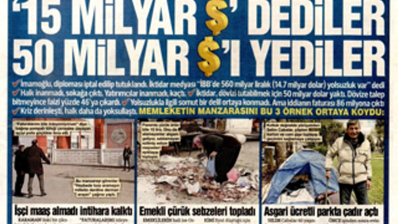 İktidar ülkenin gerçek sorunlarını sümenaltı ederken, önce İstanbul Büyükşehir Belediyesi (İBB) Başkanı Ekrem İmamoğlu’nun diploması iptal edildi, ardından İBB’de 560 milyar TL’lik (14.7 milyar dolar) yolsuzluk iddiasıyla soruşturma başlatıldı. İktidar, bu soruşturmanın etkisiyle sadece Merkez Bankası rezervlerinden 50 milyar dolar harcadı.