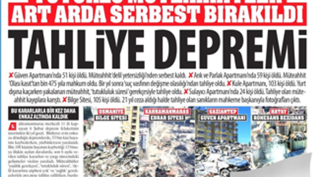 Karar'ın haberine göre, 6 Şubat depremlerinde bin 100 kişinin hayatını kaybettiği 13 binaya ilişkin açılan davalarda, son 6 ay içinde müteahhitler ‘kocama hali’, ‘tutuklulukta kaldığı süre’, ‘delilleri karartma’, ‘kanıtları değiştirme şüphesi yok’ ve ‘sağlık sorunları’ gerekçeleriyle peş peşe tahliye edildi. Bazı müteahhitler için tekrar tutuklama kararı çıksa da bu kişiler kayıplara karıştı. Mağdur ailelerin adalet arayışı ise sürüyor.