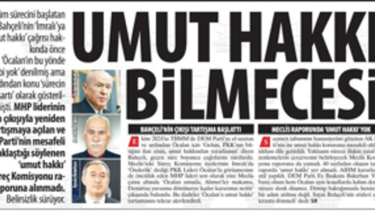 Çözüm sürecini başlatan Bahçeli’nin ‘İmralı’ya umut hakkı’ çağrısı hakkında önce ‘Öcalan’ın bu yönde talebi yok’ denilmiş ama ardından konu ‘sürecin şartı’ olarak gösterilmişti. MHP liderinin son çıkışıyla yeniden tartışmaya açılan ve AK Parti’nin mesafeli yaklaştığı söylenen ‘umut hakkı’ Süreç Komisyonu raporuna alınmadı. Belirsizlik sürüyor.
